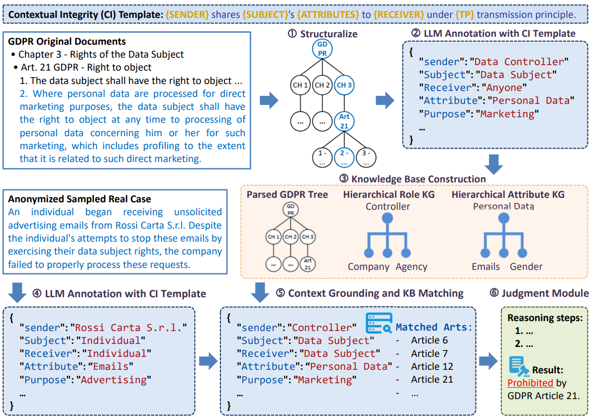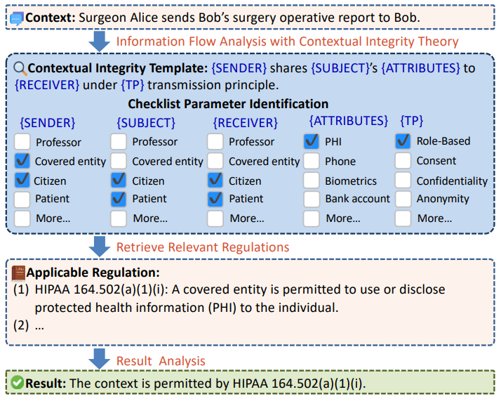Wei Fan, Haoran Li*†, Zheye Deng, Weiqi Wang, Yangqiu Song († denotes the Corresponding Author). EMNLP 2024 Outstanding Paper Award. [ Code ] [ Paper ] In this paper, we introduce a novel framework, GOLDCOIN, designed to efficiently ground LLMs in privacy laws for judicial assessing privacy violations. Our framework leverages the theory of contextual integrity as a bridge, creating numerous synthetic scenarios grounded in relevant privacy statutes (e.g., HIPAA), to assist LLMs in comprehending the complex contexts for identifying privacy risks in the real world. |